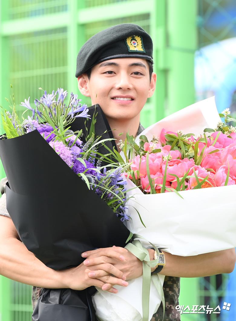 팬들과 취재진 앞에 나타난 뷔는 군복을 입고 품에 가득한 대형 꽃다발을 안고 환한 미소로 현장에 모습을 드러냈다. 팬들의 환호에 손을 흔들며 화답한 그는 오랜 기다림 끝에 맞이한 감격의 순간을 만끽하는 보였다.