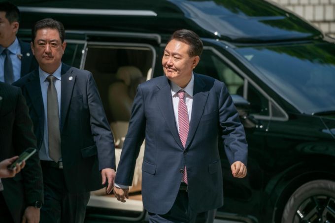 윤석열 전 대통령이 지난 9일 서울 서초구 서울중앙지방법원에서 열린 내란 우두머리 혐의·직권남용 권리행사 방해 혐의 사건 6차 공판에 출석하고 있다. /사진=뉴시스 |