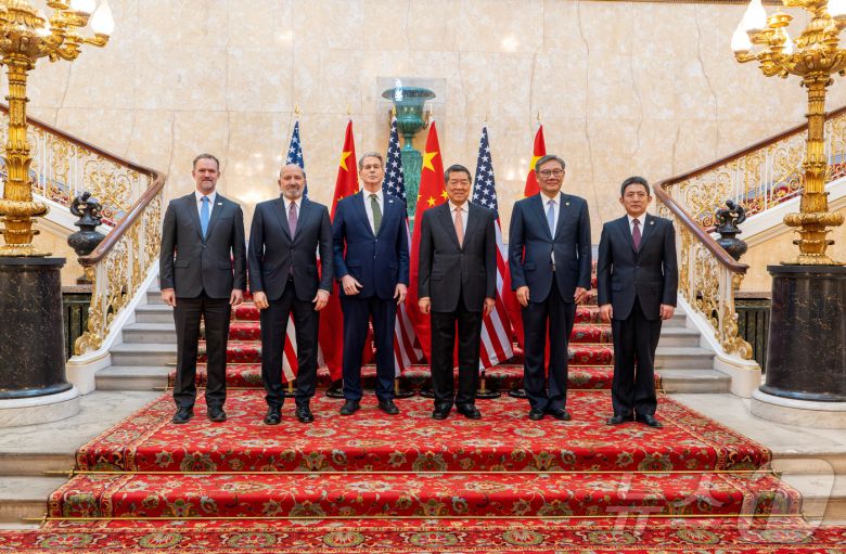 9일(현지시간) 영국 런던 랭커스터 하우스에서 열린 무역 협상에서 제이미슨 그리어 미국 무역대표부 대표, 하워드 러트닉 미국 상무장관, 스콧 베선트 미국 재무장관, 허리펑 중국 부총리, 왕원타오 중국 상무부장, 리청강 중국 국제무역 담당 대표 겸 상무부 부부장이 기념촬영을 하고 있다. ⓒ 로이터=뉴스1 ⓒ News1 정은지 특파원 |