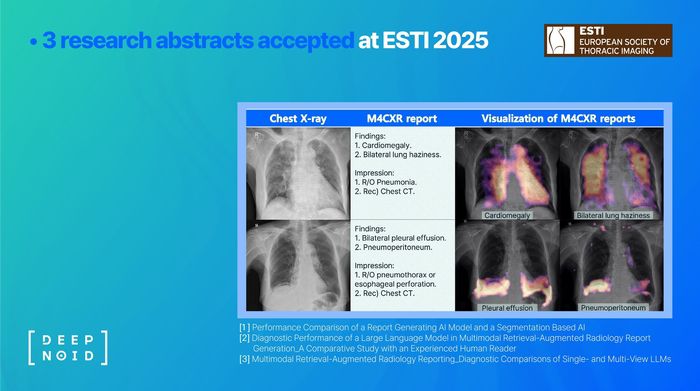 딥노이드는 정연주 부산대병원 교수 연구팀이 진행한 흉부 엑스레이(CXR) 판독 소견서 초안 생성 모델 'M4CXR'의 성능 평가에 대한 연구 초록 3편이 ESTI 2025에 채택됐다고 10일 밝혔다. ESTI는 유럽흉부영상의학회가 주관하는 국제 영상의학 학술대회다. 올해 학술대회는 오는 12일(이하 현지시간)부터 14일까지 사흘간 노르웨이 베르겐에서 열린다.