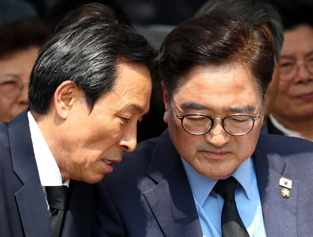 우원식 국회의장과 대통령실 정무수석 비서관으로 임명된 우상호 이한열기념사업회 이사장이 9일 서울 서대문구 연세대학교 이한열 동산에서 열린 제38주기 이한열 추모식에 참석해 대화를 나누고 있다.[사진=연합뉴스]