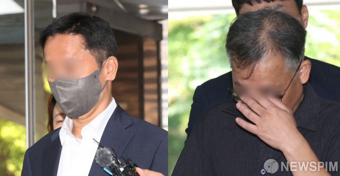 화천대유자산관리 대주주 김만배 씨로부터 '대장동 사건과 관련해 유리한 기사가 보도될 수 있도록 해달라'는 부정 청탁을 받고 금품을 수수한 혐의로 기소된 전직 언론인들이 첫 재판에서 혐의를 모두 부인했다. 사진은 전직 중앙일보 간부 조 모(왼쪽) 씨와 한겨레신문 전 부국장 석 모 씨가 지난해 7월 15일 오전 서울 서초구 서울중앙지법에서 열리는 영장실질심사에 출석하는 모습. [사진=뉴스핌 DB]