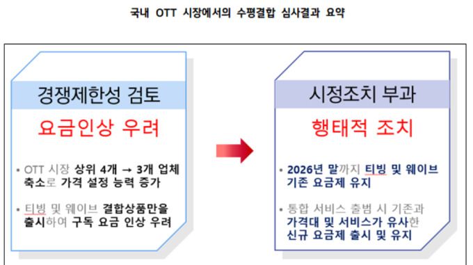 이에 공정위는 2026년 말까지 티빙과 웨이브가 현행 요금제를 유지하고, 두 서비스가 통합될 때도 기존과 유사한 수준의 요금제를 출시·유지하는 등 행태적 시정조치를 부과하기로 했다.