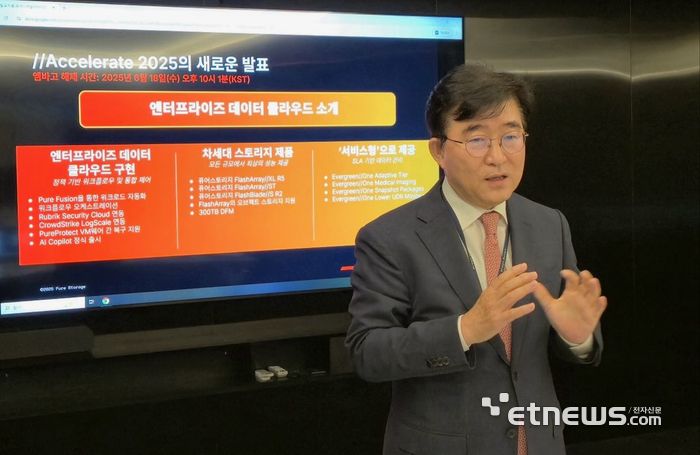 전인호 퓨어스토리지 코리아 지사장이 미디어 브리핑을 진행하고 있다.