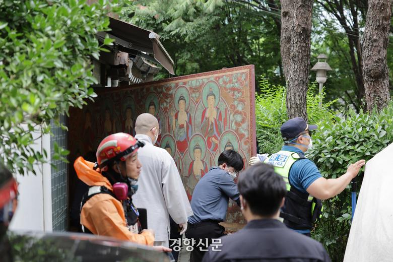 10일 서울 종로구 조계사 옆 한국불교역사문화기념관 국제회의장에서 화재가 발생해 관계자들이 문화재를 옮기고 있다. 정지윤 선임기자 |