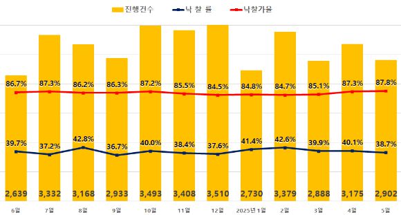 5월 전국 아파트 진행건수와 낙찰률, 낙찰가율. [사진=지지옥션]