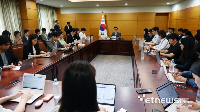 김민석 국무총리 후보자가 10일 오전 서울 종로구 통의동 금융감독연수원에 마련된 청문회 준비단 사무실에서 출입기자들과 간담회를 갖고 있다.  이동근기자 foto@etnews.com