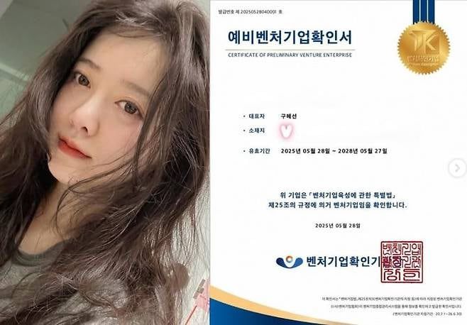 소셜미디어 확인서에는 구혜선이 해당 기업의 대표자로 올라 있다. 유효 기간은 지난달 28일부터 2028년 5월 27일까지 3년간이다.