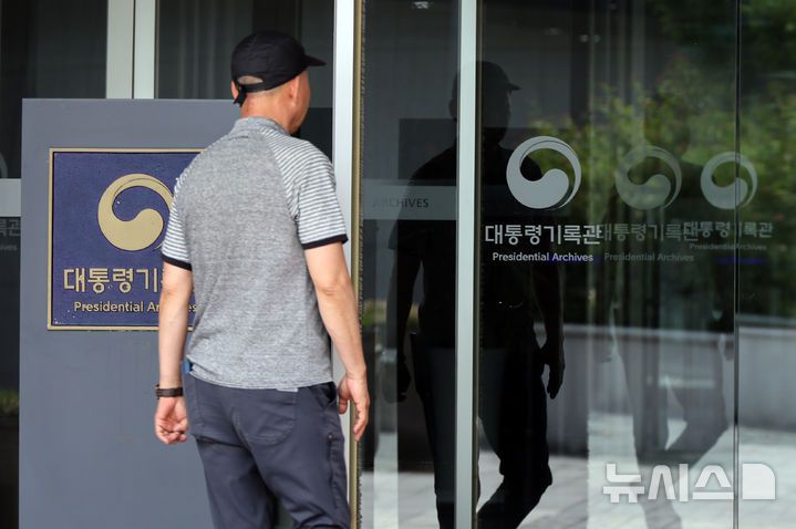 [세종=뉴시스] 강종민 기자 = '채상병 사망 사건 수사 외압 의혹'을 수사하는 고위공직자범죄수사처가 세종시 어진동 대통령기록관에 대한 압수수색을 벌인 10일 대통령기록관으로 한 시민이 출입하고 있다. 2025.06.10. ppkjm@newsis.com