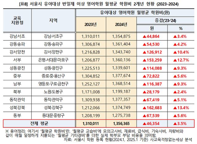 서울 영유아(0∼5세) 인구는 2023년 16만5508명에서 2024년 15만9742명으로 3.5% 감소했고, 경기 5개 지역도 17만7780명에서 17만551명으로 4.07% 줄었다. 그러나 영어유치원에 지출하는 비용은 되레 증가했다. 서울은 2023년 월평균 131만원에서 2024년 135만6365원으로 3.5% 인상됐고, 경기 5개 지역은 111만4209원에서 122만6711원으로 10.1% 증가했다.