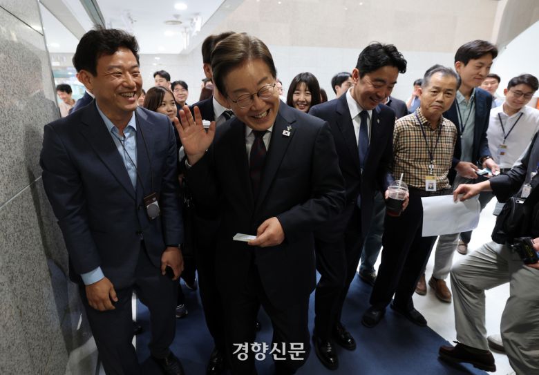 이재명 대통령이 10일 용산 대통령실 직원식당에서 식사를 마친 뒤 집무실로 돌아가며 취재진과 인사하다 시계를 들여다보고 있다. 대통령실사진기자단
