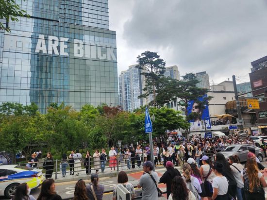 경찰 추산 약 1500명의 팬들이 하이브 사옥 주변에 모여 방탄소년단 RM과 뷔의 전역을 축하했다. 하이브