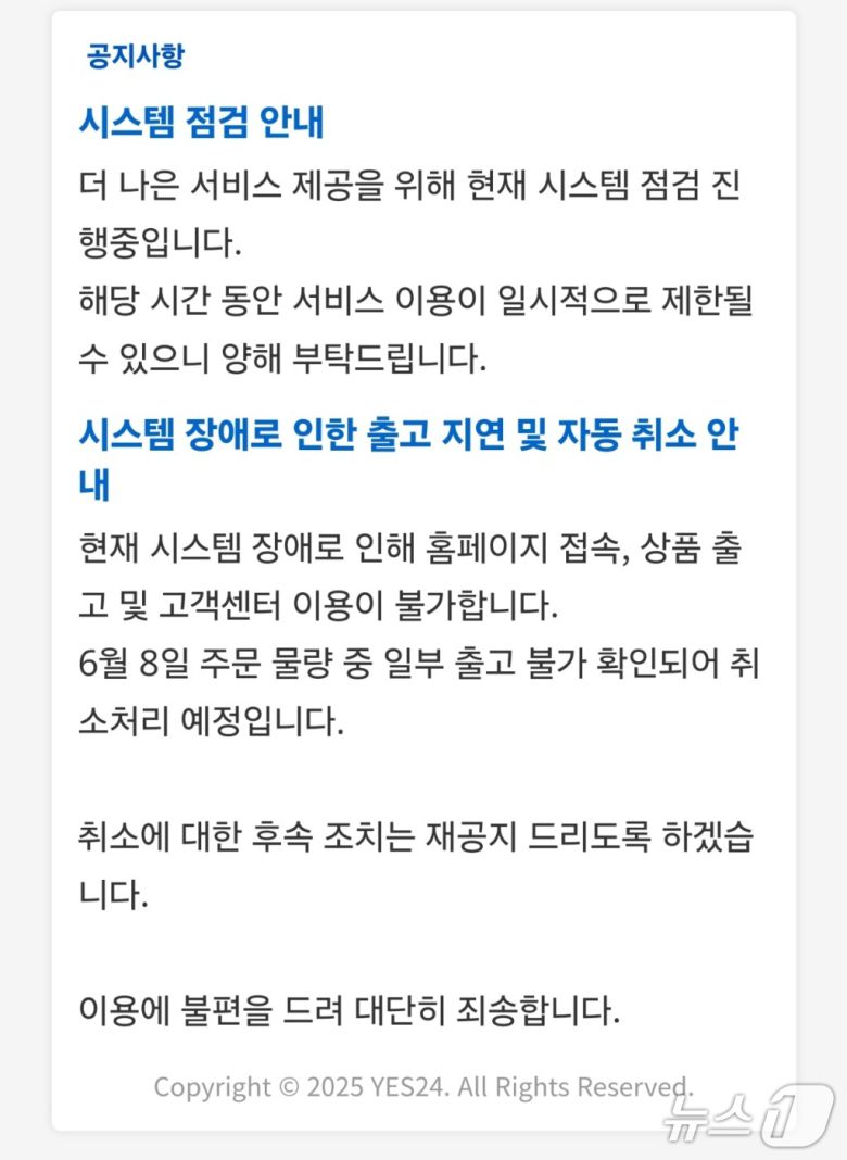 '시스템 점검 중'이라던 예스24, 뒤늦게 입장문 게재