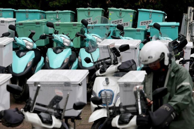 서울 강남구 우아한청년들 자회사 ‘딜리버리N’에 배달용 오토바이들이 주차되어 있다. 연합뉴스