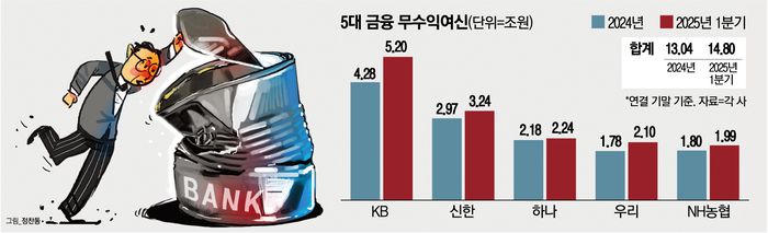 금융지주 계열사 중에서는 은행의 무수익대출이 가장 많이 증가했다. 5대 은행의 무수익여신은 작년 말 4조3733억원에서 1분기 만에 1조원 넘게 늘어나며 5조3759억원에 달했다. 기업과 가계 전반에서 부실 자산이 불어나는 가운데 특히 기업에서의 증가세가 눈에 띈다. KB국민은행은 무수익여신이 작년 말 9231억원에서 올해 1분기 1조3680억원으로 48% 증가했는데, 이 중 기업 비중이 70%에서 76%로 치솟았다.