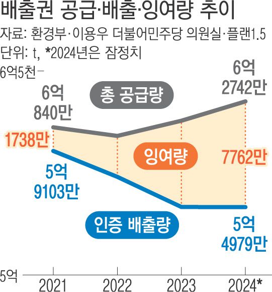 경향신문이 9일 환경단체 플랜1.5와 이용우 더불어민주당 의원실을 통해 입수한 ‘연도별 배출권 잉여량 현황’을 보면, 2019~2021년 1700만t 수준이던 배출권 잉여량이 계속 늘어 지난해 7762만t으로 급증한 것으로 잠정 집계됐다. 배출권거래제를 적용받는 업체들의 제3차 계획기간(2021~2025년) 연평균 배출허용총량인 6억970만t의 10분의 1을 웃도는 규모다. 배출권 잉여량은 배출권 공급량에서 인증 배출량을 뺀 수치인데 기업들이 그해 할당받은 배출권도 모두 쓰지 못하는 상황에서 과거 할당받은 배출권도 쌓여 있어 나타난 현상이다.