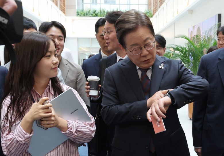 이재명 대통령이 10일 용산 대통령실 직원식당에서 식사를 마친 뒤 집무실로 돌아가며 취재진과 인사하다 시계를 들여다보고 있다. 대통령실사진기자단