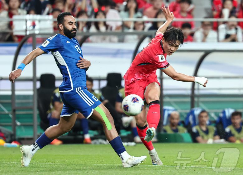 10일 오후 서울 마포구 상암동 서울월드컵경기장에서 열린 2026 국제축구연맹(FIFA) 북중미 월드컵 아시아 3차 예선 B조 10차전 대한민국과 쿠웨이트의 경기, 대한민국 오현규가 슛을 시도하고 있다. 2025.6.10/뉴스1 ⓒ News1 김도우 기자