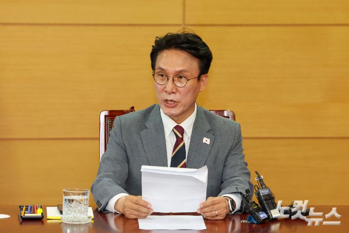 김민석 국무총리 후보자가 10일 오전 서울 종로구 통의동 금융감독연수원에 마련된 청문회 준비단 사무실에서 기자간담회를 하고 있다. 류영주 기자 |