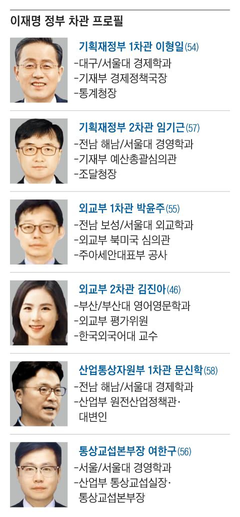 이형일 기재부 1차관은 기재부 경제정책국장과 차관보 등을 거친 ‘정책통’이다. 1998년 IMF 외환 위기 직후 재정경제부(현 기재부) 금융정책국에서 근무한 경험도 있다. 이 차관은 통화에서 “경제 살리기와 민생 안정에 매진하겠다”고 말했다. 임기근 기재부 2차관은 기재부 예산총괄심의관과 재정관리관 등 예산·재정 보직을 두루 거쳤다. 강유정 대통령실 대변인은 인선 발표에서 “임 2차관은 자타 공인 예산 전문가”라고 했다. 임 2차관은 이 대통령이 긴급 편성을 지시한 추가경정예산 편성을 총괄하게 된다.