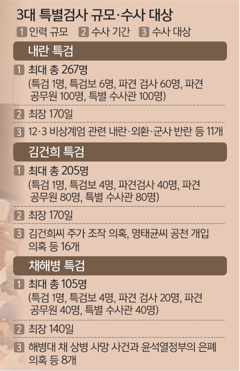 내란 특검은 최대 267명으로, 역대 특검 중 가장 많은 인원이 투입됐던 국정농단 특검팀(105명)의 2배 이상 규모다. 내란 특검은 특검 1명에 특검보를 6명까지 둘 수 있게 했다. 검사 60명이 파견되고, 파견공무원 100명과 특별수사관 100명을 둘 수 있다.