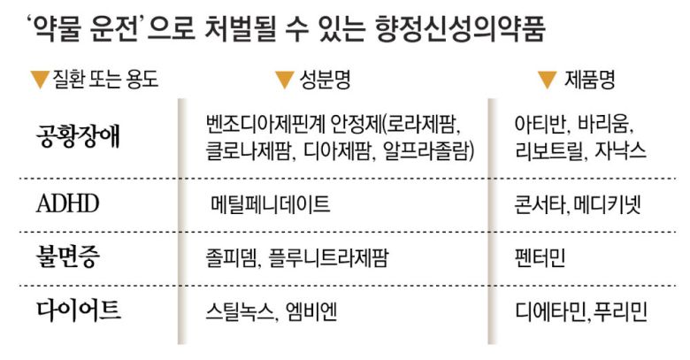 10일 복수의 제약 전문가들에 따르면 공황장애나 주의력결핍과잉행동장애(ADHD), 우울증 등에 쓰이는 약을 복용하고 운전했을 때 약물 검사에서 양성이 나올 수 있고 형사 처벌로 이어질 수 있다. 이러한 약품의 일부 성분이 향정신성의약품에 해당해 교통사고를 일으킬 수 있기 때문이다.
