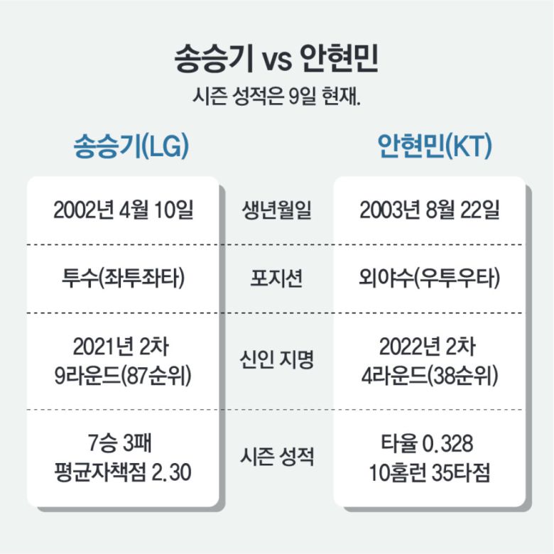 올 시즌 프로야구는 역대급 신인 풍년이란 평가가 이어지고 있다. 그런데 신인왕 레이스에서 앞장서고 있는 건 두 ‘중고 신인’이다. 군 복무를 거쳐 그라운드로 돌아온 LG 왼손 투수 송승기(23)와 KT의 거포 외야수 안현민(22)이 두 주인공이다.