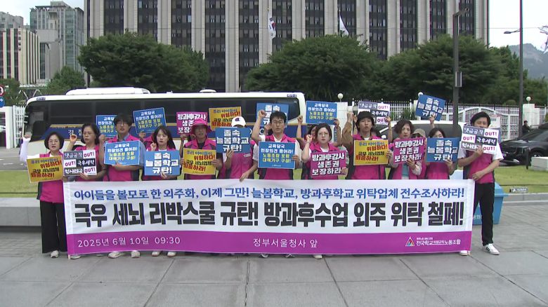 전국학교비정규직노동조합은 어제(10일) 정부서울청사 앞에서 기자회견을 열고 리박스쿨이 늘봄학교의 외주 위탁 방식의 허점을 이용해왔다며, 위탁 운영을 중단하고 공공성을 강화해야 한다고 주장했습니다.