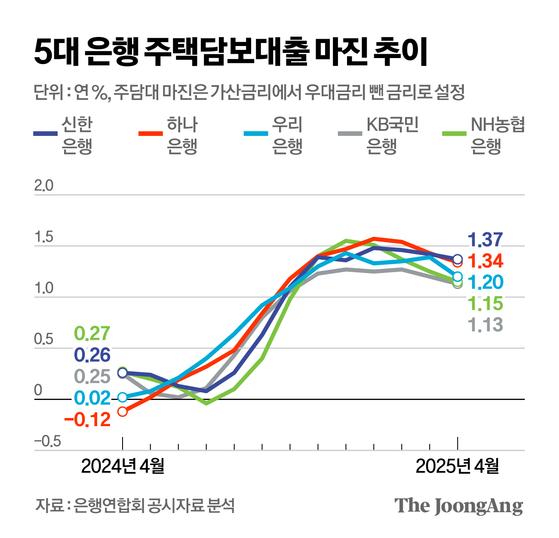 실제 5대 은행의 주담대 마진은 지난해 8월까지 연 0.1%~연 0.64%에 불과했다. 하지만 이후 급등하기 시작해 지난해 12월(연 1.27%~연 1.55%)에는 1% 초중반까지 치솟았다. 이렇게 확대한 마진은 가계대출 증가세가 잠잠해진 올해까지도 유지 중이다.