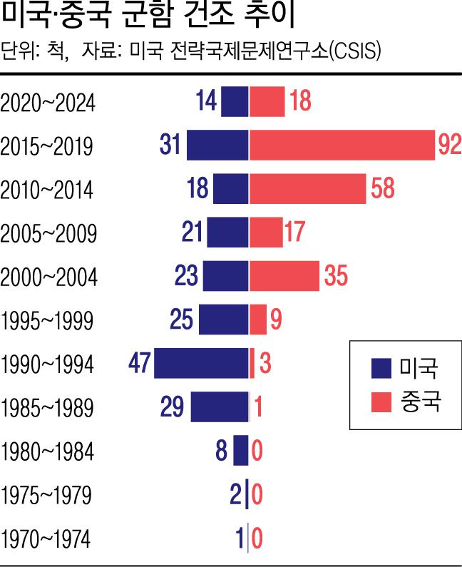 미국이 한·일 모두에 조선 협력을 요청한 이유는 중국에 뒤처진 ‘군함 수’와 관련이 있다. 중국 해군의 군함 규모는 2015년부터 미국을 넘어서기 시작해 올해는 미국보다 73척 더 많은 270척을 보유 중인 것으로 알려져 있다. 미국의 전략국제문제연구소(CSIS)는 지난 4일 ‘중국의 해군력 증강 분석’ 보고서에서 “미국 해군에 반세기 만에 처음으로 해상에서 패배할 가능성이 점점 커지고 있다”고 평가하며 “일본, 한국과의 관계를 통해 중국의 (군함의 수적) 우위를 약화시킬 수 있을 것”이라고 분석했다.