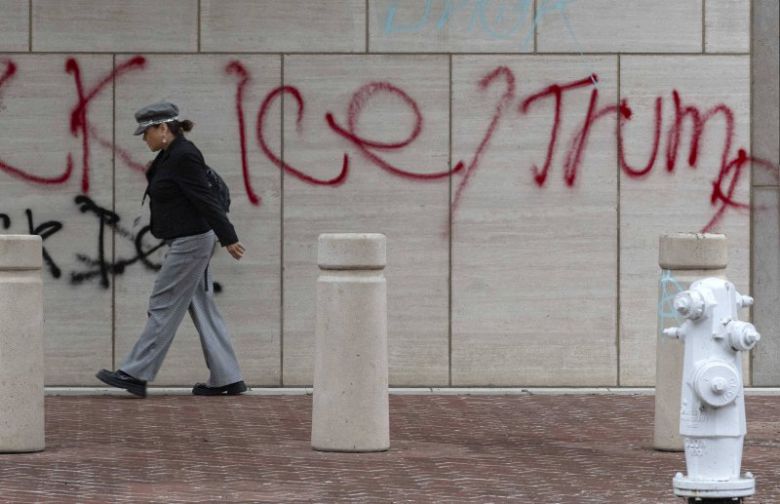 LA의 연방 정부 건물 벽에 트럼프 대통령을 비난하는 낙서가 그려져 있다. AP연합뉴스