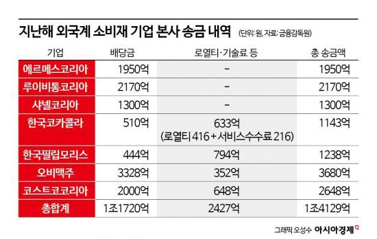 샤넬코리아·루이비통코리아·에르메스코리아·한국코카콜라·한국필립모리스·오비맥주·코스트코코리아 등 주요 외국계 소비재·유통 기업 7곳이 지난해 배당금과 로열티 등 명목으로 본사로 송금한 금액이 1조4000억원을 넘어선 것으로 나타났다. 한국에서 벌어들인 경영 성과를 훨씬 웃도는 수준을 해외로 가져가면서 이들 기업은 법인세 부담을 덜었지만, 대규모 자금 유출로 인해 우리나라 경상수지는 악화했다.