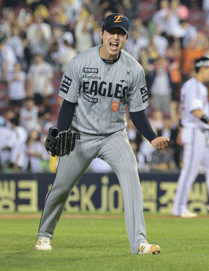 28일 서울 잠실야구장에서 열린 LG 트윈스전 연장 11회말 2사 만루에서 함창건을 삼진 아웃으로 처리하며 경기를 끝낸 뒤 포효하는 한화 이글스 조동욱 |
