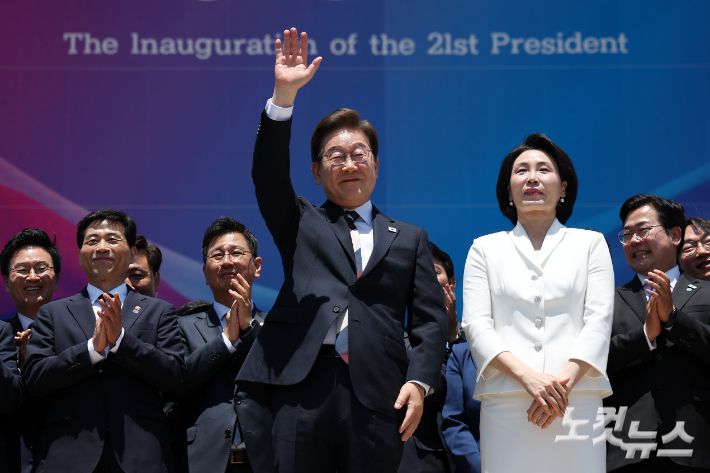 이재명 대통령 내외가 4일 오전 서울 여의도 국회 로텐더홀에서 취임 선서를 마치고 나와 잔디광장에 모인 시민들을 향해 인사하고 있다. 윤창원 기자 |