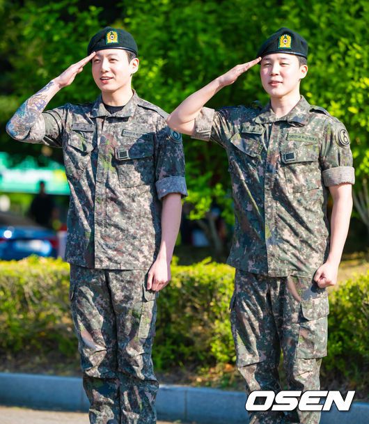 [OSEN=지민경 기자] 그룹 방탄소년단의 지민과 정국이 칼각 경례로 전역을 신고했다.