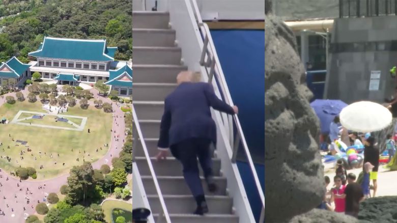 도널드 트럼프 미국 대통령이 비행기에 오르다 계단에서 휘청이며 넘어질 뻔한 영상이 화제입니다.
