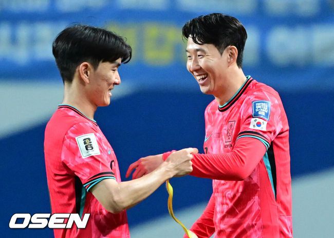 [OSEN=서울월드컵경기장, 조은정 기자]서울월드컵경기장이 화려한 골 폭죽으로 물들었다. 홍명보호가 월드컵 예선 마지막 경기에서 팬들에게 시원한 대승을 선물했다.홍명보 감독이 이끄는 대한민국 축구대표팀은 10일 오후 8시 서울월드컵경기장에서 열린 2026 국제축구연맹(FIFA) 북중미 월드컵 아시아 3차 예선 조별리그 B조 10차전 최종전에서 쿠웨이트를 4-0으로 격파했다.후반 한국 황인범이 교체출전하는 손흥민에게 주장 완장을 채워주고 있다. 2025.06.10 /cej@osen.co.kr |