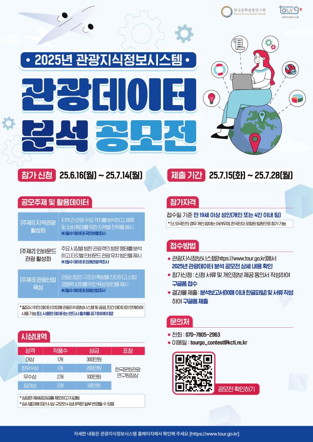 관광 데이터로 관광 문제를 해결할 수 있을까. 한국문화관광연구원(원장 김세원)은 ‘관광데이터에 대한 국민의 관심을 도모하고, 데이터의 이용을 증진하기 위해 2025년 관광데이터 분석 공모전’을 개최한다고 11일 밝혔다.