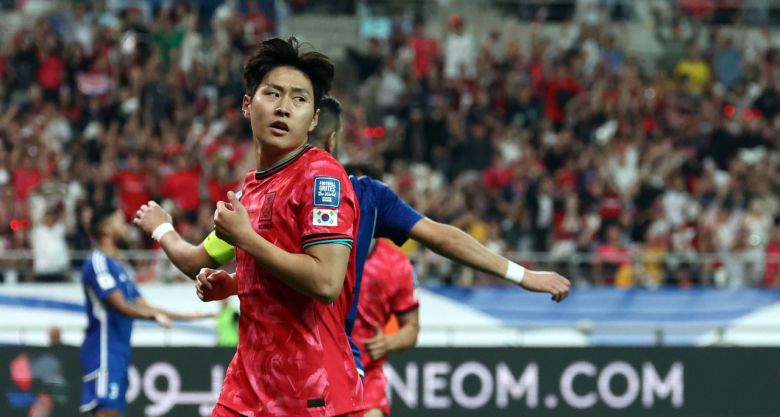 10일 서울월드컵경기장에서 열린 2026 북중미 월드컵 아시아 3차 예선 최종전 한국과 쿠웨이트의 경기. 후반전 한국 이강인이 추가골을 넣고 뿌듯한 표정을 짓고 있다. [연합]