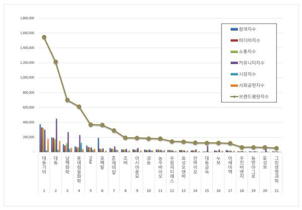 2위, 대동 브랜드는 참여지수 199,746 미디어지수 193,844 소통지수 176,141 커뮤니티지수 451,867 시장지수 37,691 사회공헌지수 153,728이 되면서 브랜드평판지수 1,213,017로 분석됐다. 지난 5월 브랜드평판지수 1,382,127과 비교해보면 12.24% 하락했다.​