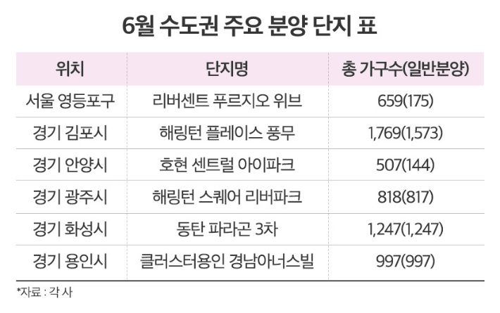 경기권 주요 단지로는 김포 '해링턴 플레이스 풍무'와 안양 '호현 센트럴 아이파크', 화성 '동탄 파라곤 3차', 용인 '클러스터용인 경남아너스빌'등이 꼽힌다.