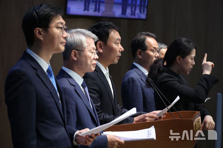 [서울=뉴시스] 고승민 기자 = 더불어민주당 장경태, 김용민 등 의원들이 11일 서울 여의도 국회 소통관에서 검찰 개혁 관련 기자회견을 하고 있다. 2025.06.11. kkssmm99@newsis.com