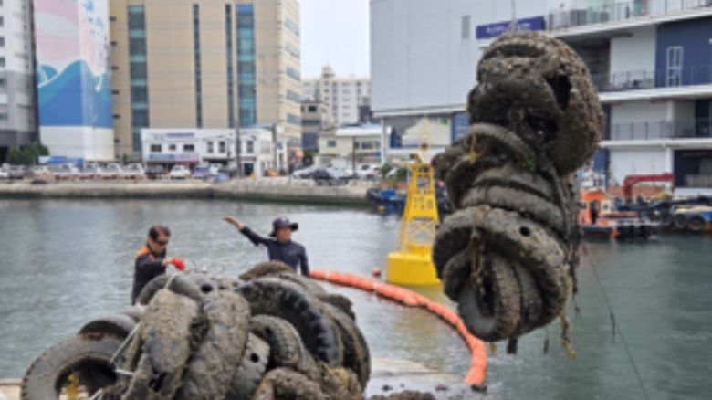 영도구 물양장서 1시간 만에 폐타이어 약 80개, 15톤 무게 수거
