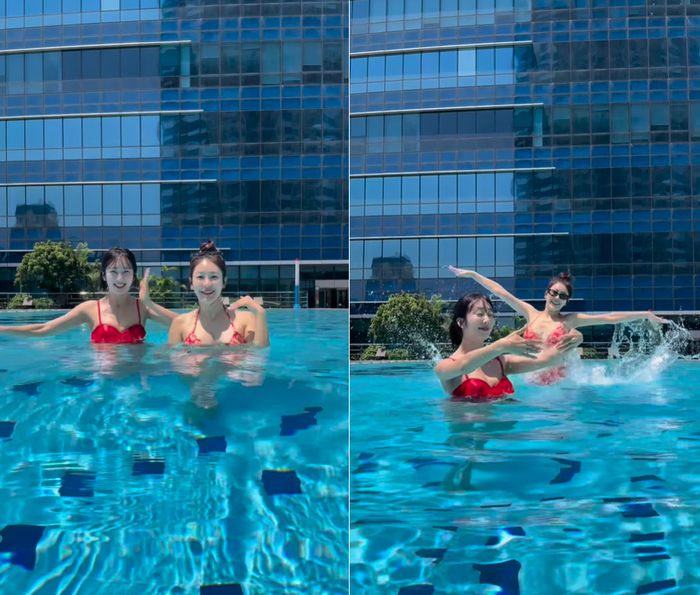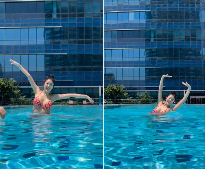 영상 속 김연정은 맑은 하늘 아래 펼쳐진 호텔 야외 수영장에서 붉은색 바탕의 비키니 수영복을 입고 물속에서 아티스틱 스위밍 포즈를 취하며 밝고 에너지 넘치는 모습을 선보였다. 환한 미소와 함께 두 팔을 위로 뻗은 포즈가 인상적이며, 주변의 푸른 물과 햇살이 어우러져 한여름의 청량한 분위기를 자아낸다.