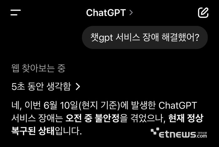 11일 오전 7시 오픈AI의 생성형 AI 서비스 '챗GPT'에 장애 해결 여부를 질문한 결과. ⓒ박종진기자 |