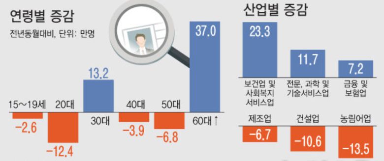 연령별로는 60세 이상(+37만 명)과 30대(+13만2000명)에서 증가했다. 5월 기준 60세 이상 취업자 수는 처음으로 700만 명을 넘어섰다. 이에 반해 20대(-12만4000명), 40대(-3만9000명), 50대(-6만8000명) 에서는 감소했다.