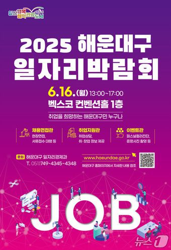 (부산=뉴스1) 손연우 기자 = 부산 해운대구는 오는 16일 오후 1~5시 벡스코 제1전시장 컨벤션홀에서 '2025년 해운대구 일자리박람회'를 연다고 11일 밝혔다.