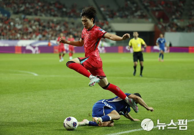 [서울 로이터=뉴스핌] 손지호 인턴기자 = 이태석이 10일 북중미 월드컵 아시아 3차 예선 B조 10차전 홈 경기에서 공격을 시도하고 있다. 2025.06.10 thswlgh50@newspim.com |