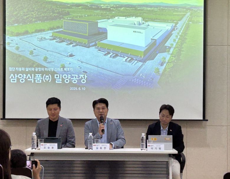 10일 경남 밀양시 부북면에 있는 밀양 제2공장 준공 기념 기자간담회에서 김동찬(가운데) 삼양식품 대표가 인사말을 하고 있다.
