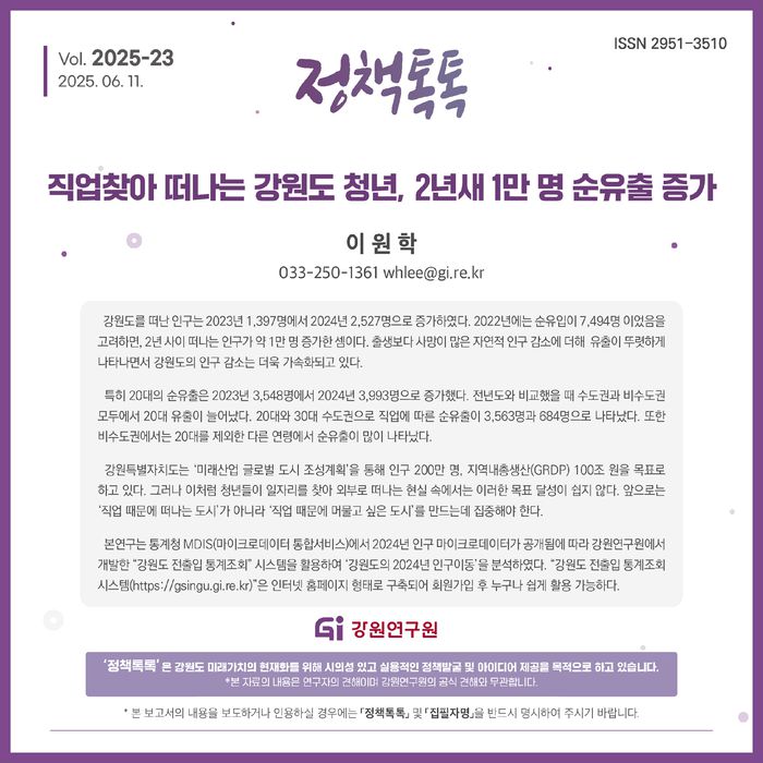 정책톡톡 제2025-23호(직업찾아 떠나는 강원도 청년, 2년새 1만 명 순유출 증가) 표지. 사진|강원연구원 |
